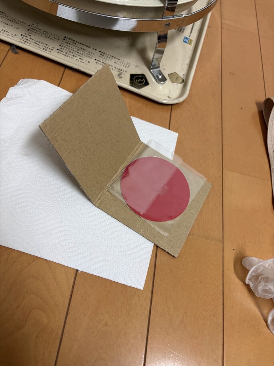 数日で、ネコポスで郵便受けに届いたのがこちらです。赤いのは2枚の雲母を分けている紙で、傷付かないようにしているのでしょうか? 2枚の雲母が固い段ボール紙に挟まれて送られてきました。中の雲母自体は、プラスチックのシート見たいな感じのペラペラなもので。ほぼ円と言うか、(楕円形なのかな?)と思ったりしてましたが、完全に〇でした。