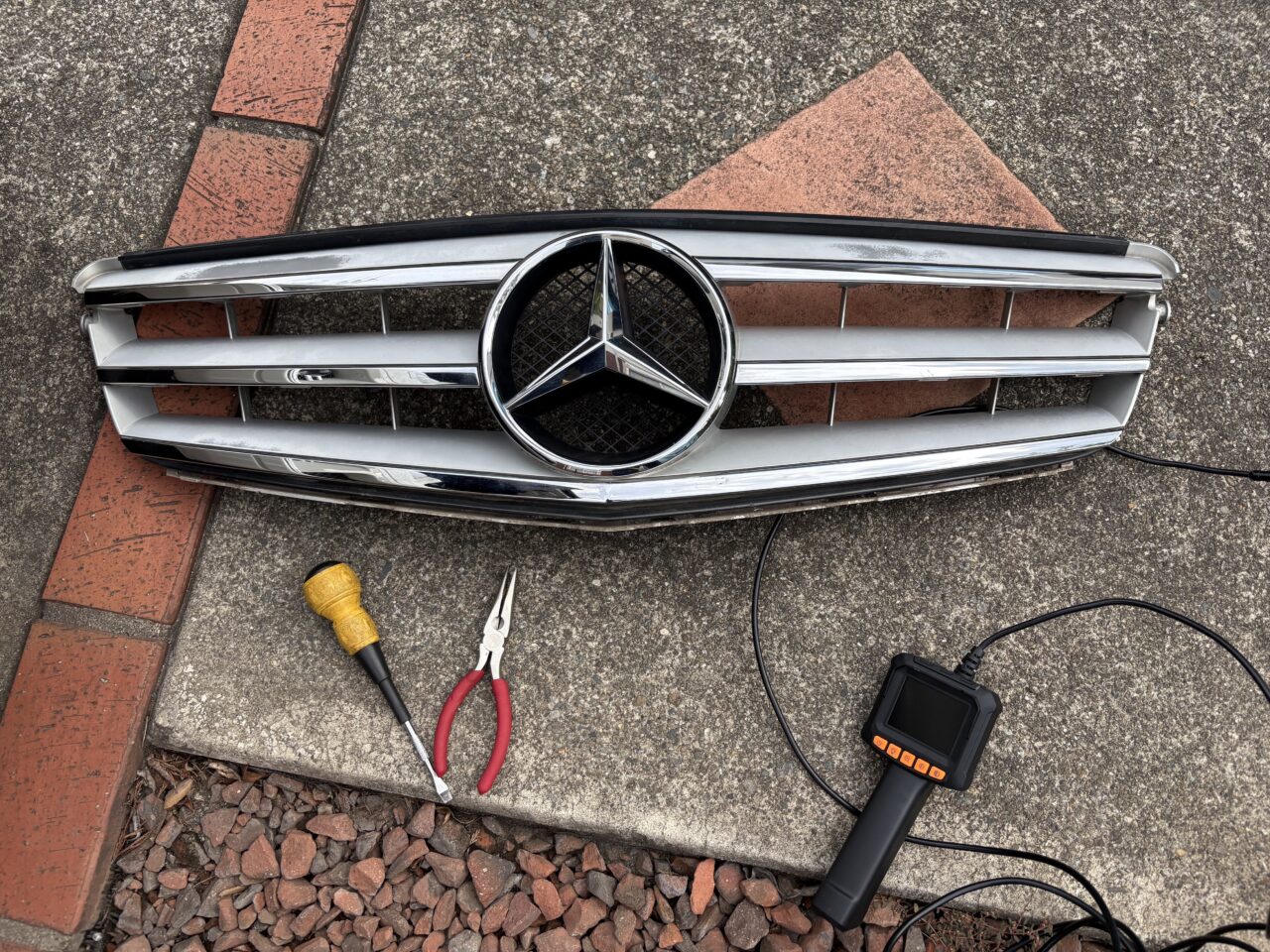 グリルの取り外し方は、まずボンネットを開けて、下側に6か所ほど爪があるので、左から順にぐっと手で力を入れて押せば、はずれます。真ん中の2つ(ちょうどベンツエンブレムの下)が、なかんかはずれず、マイナスドライバーを差し込んでなんとか爪を外す事が出来ました。