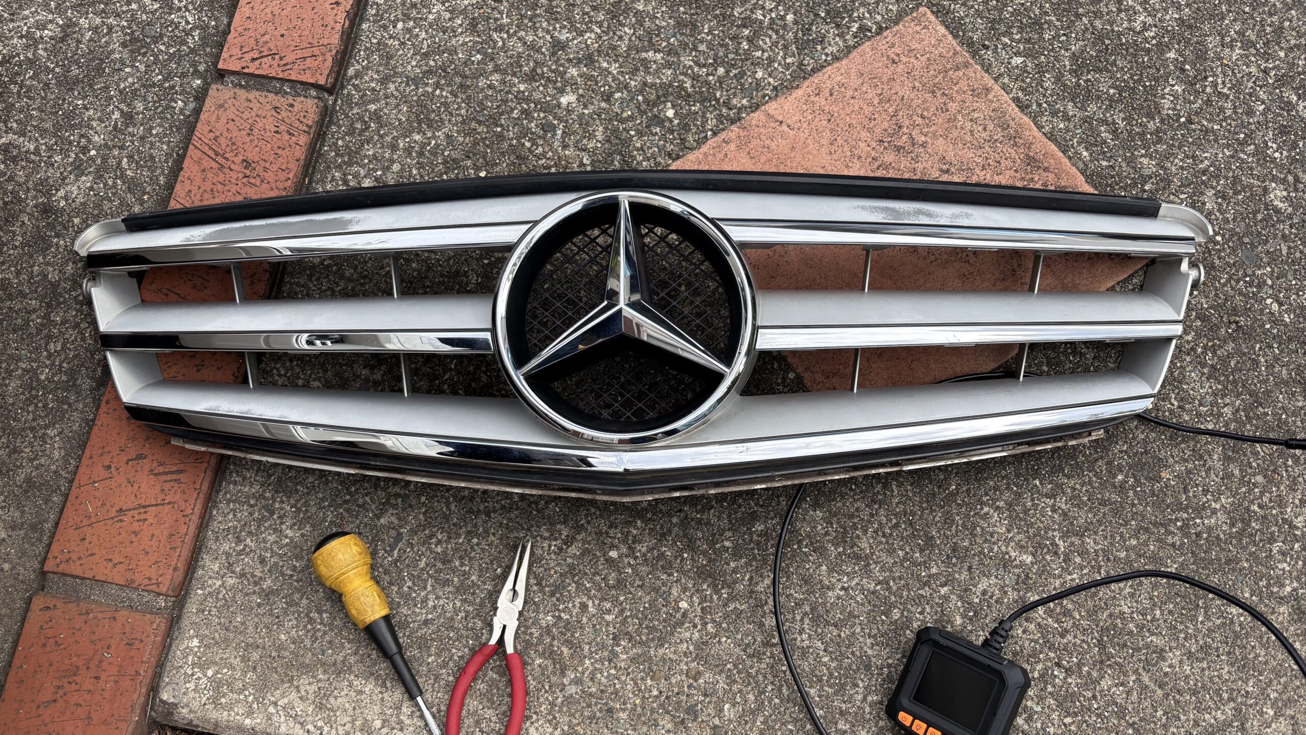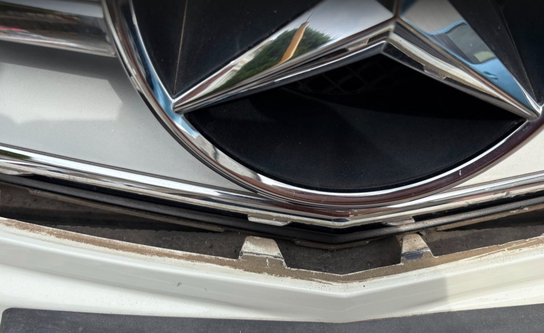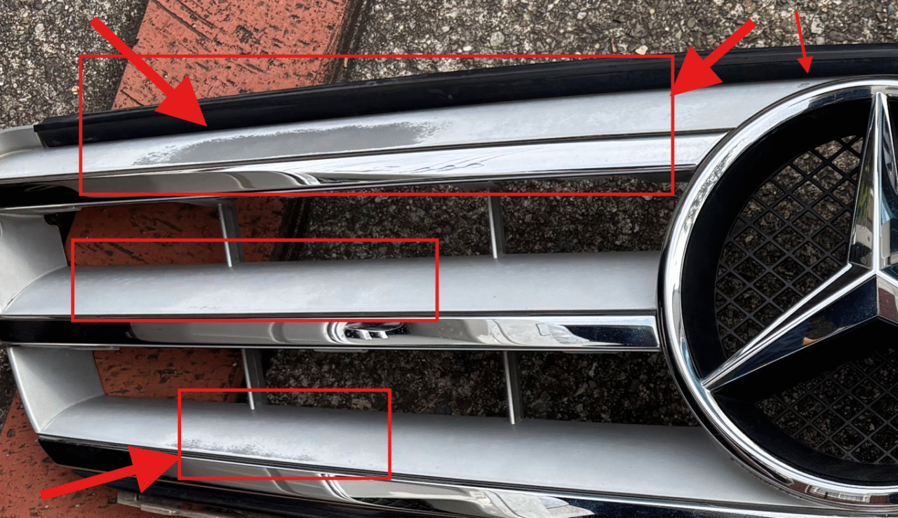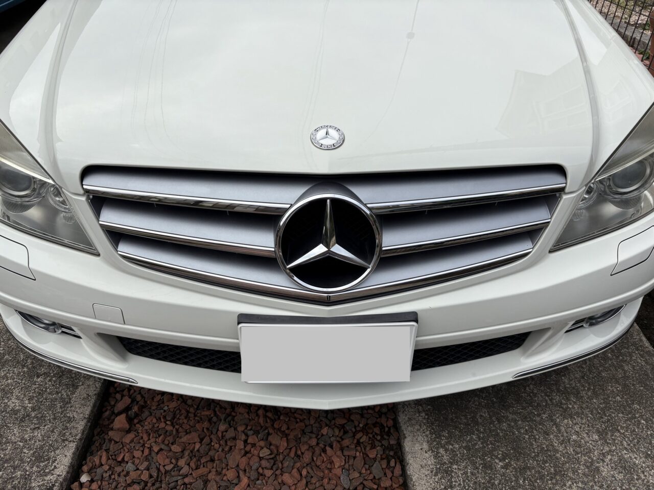 我が家のC200(2007年前期)。長年の紫外線や洗車で、銀色(メッキ風)の部分が白っぽく色あせ、クルマ全体の印象が古く見えていました。細部のくすみは放っておくと車格が損なわれます。