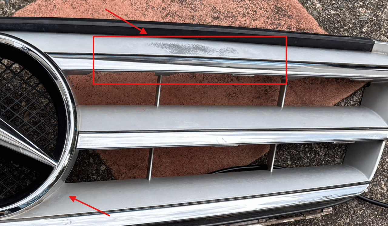 以下がフロントグリルを塗装する前に取り外した時の写真です。赤矢印や枠で囲った部分が劣化して塗装が色あせています。パッと見、かなりぼろく感じます。