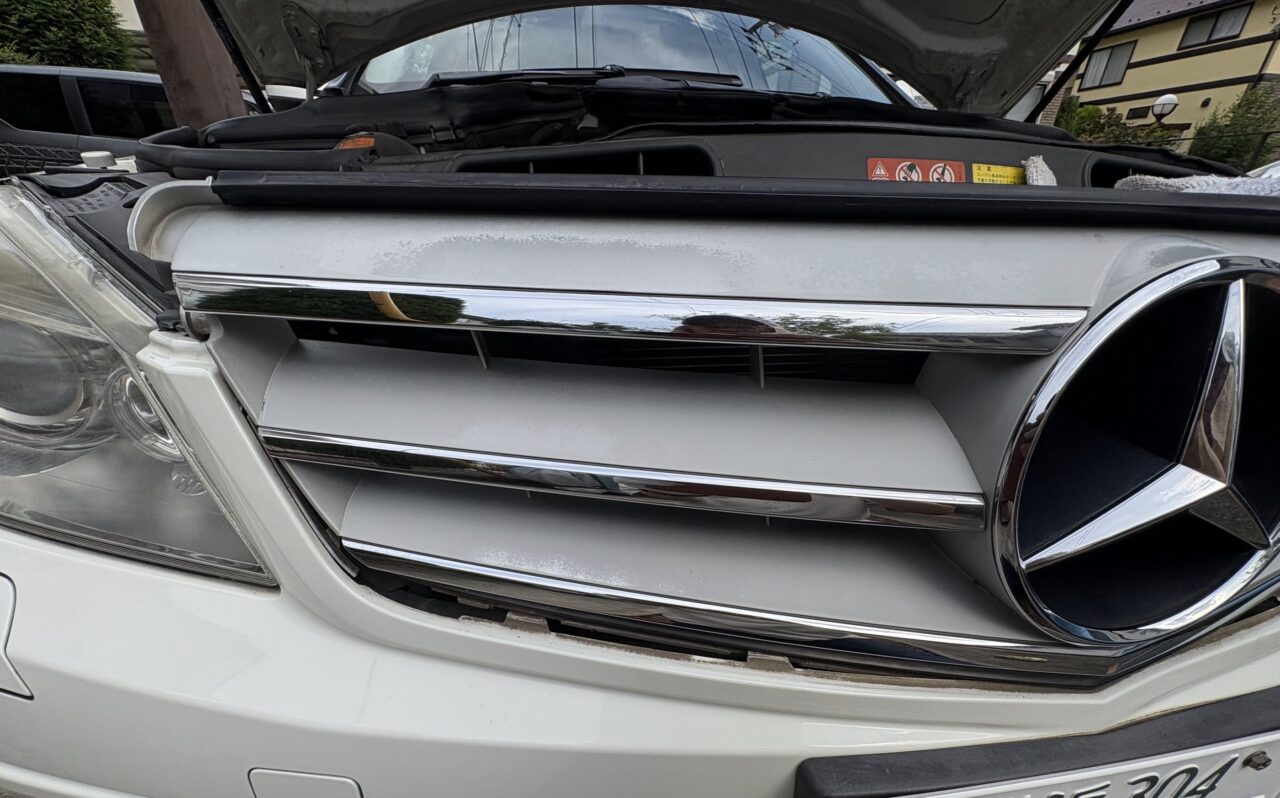 経年劣化で色あせたフロントグリルを、自分の手でリフレッシュしました。取り外しに苦労したポイントや、銀メッキ部の分解、マスキング、重ね塗りの手順を写真付きで解説します。