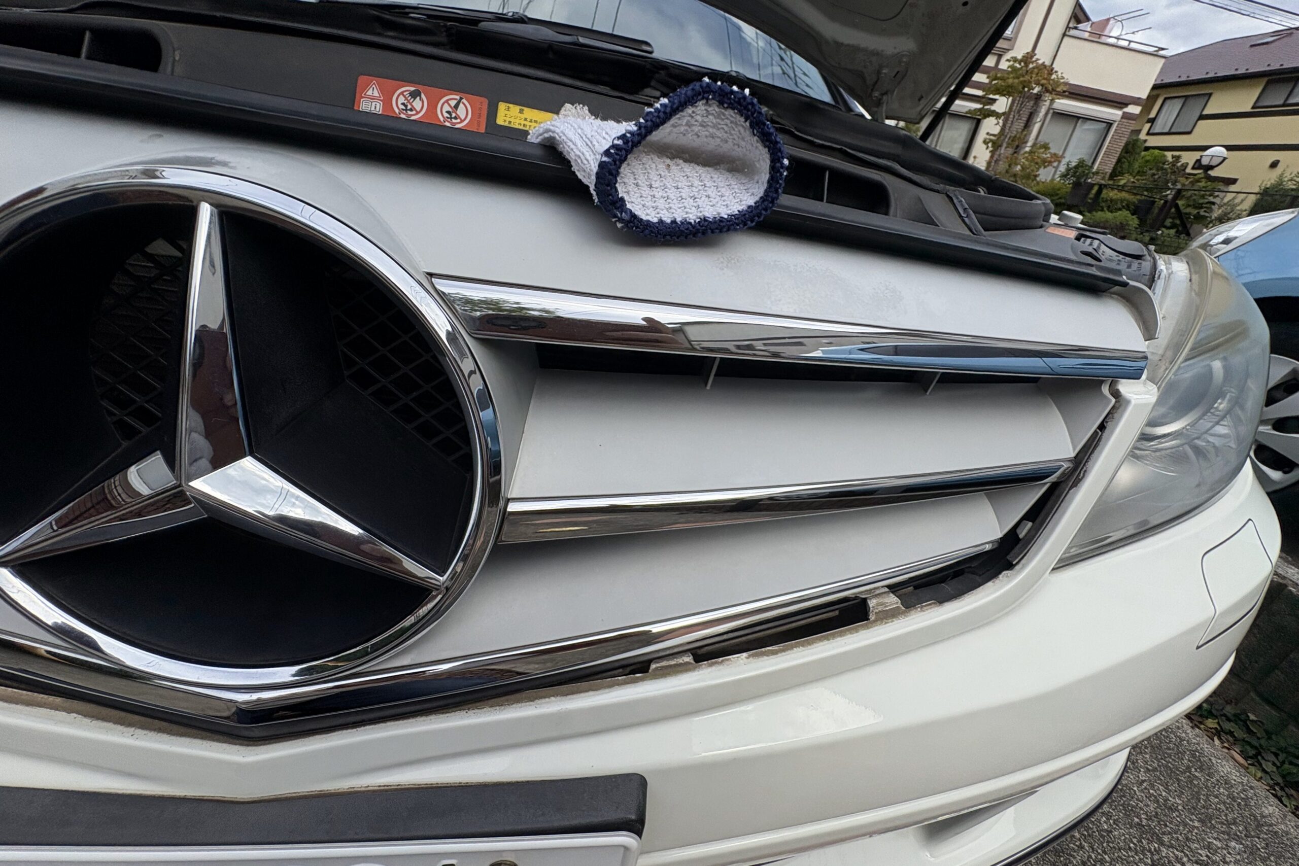 グリルの取り外し方は、まずボンネットを開けて、下側に6か所ほど爪があるので、左から順にぐっと手で力を入れて押せば、はずれます。真ん中の2つ(ちょうどベンツエンブレムの下)が、なかんかはずれず、マイナスドライバーを差し込んでなんとか爪を外す事が出来ました。